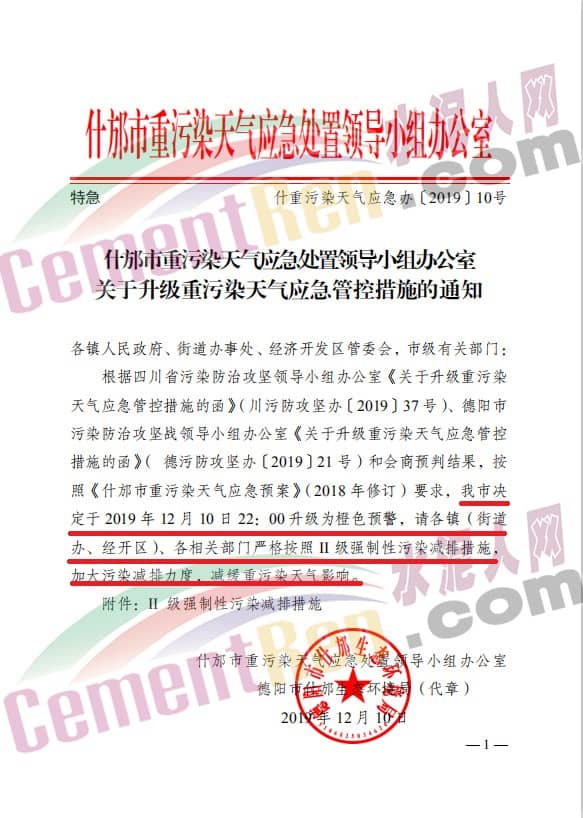 12月10日,四川省什邡市重污染天氣應(yīng)急處置領(lǐng)導(dǎo)小組辦公室和德陽市生態(tài)環(huán)境局聯(lián)合發(fā)布了《關(guān)于升級(jí)重污染天氣應(yīng)急管控措施的通知》稱,根據(jù)四川省污染防治攻堅(jiān)領(lǐng)導(dǎo)小組辦公室《關(guān)于升級(jí)重污染天氣管控應(yīng)急措施的函》(川污防攻堅(jiān)辦[2019]37號(hào))、德陽市污染防治攻堅(jiān)戰(zhàn)領(lǐng)導(dǎo)小組辦公室《關(guān)于升級(jí)重污染天氣應(yīng)急管控措施的函》(德污防攻堅(jiān)辦[2019]21號(hào))和會(huì)商預(yù)判結(jié)果,按照《什邡市重污染天氣應(yīng)急預(yù)案》(2018年修訂)要求,決定于2019年12月10日22:00升級(jí)橙色預(yù)警。具體減排措施如下: