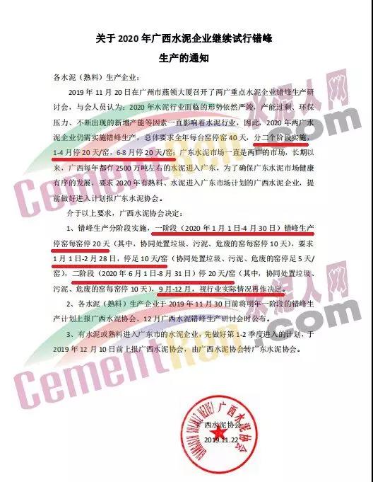 之前廣西水泥協(xié)會下發(fā)了《關于2020年廣西水泥企業(yè)繼續(xù)試行錯峰生產(chǎn)的通知》提出,2020年兩廣水泥企業(yè)仍需實施錯峰生產(chǎn),總體要求全年每臺窯停窯 40 天,分兩個階段實施,1-4月停20天/窯,6-8 月停 20 天/窯。長期以來,廣西每年都有 2500 萬噸左右的水泥進入廣東,為了確保廣東水泥市場健康有序的發(fā)展,要求2020年有熟料、水泥進入廣東市場計劃的廣西水泥企業(yè),提前做好進入計劃。