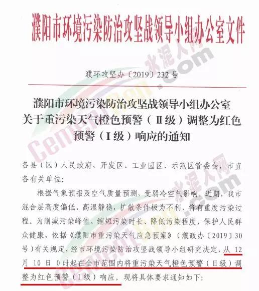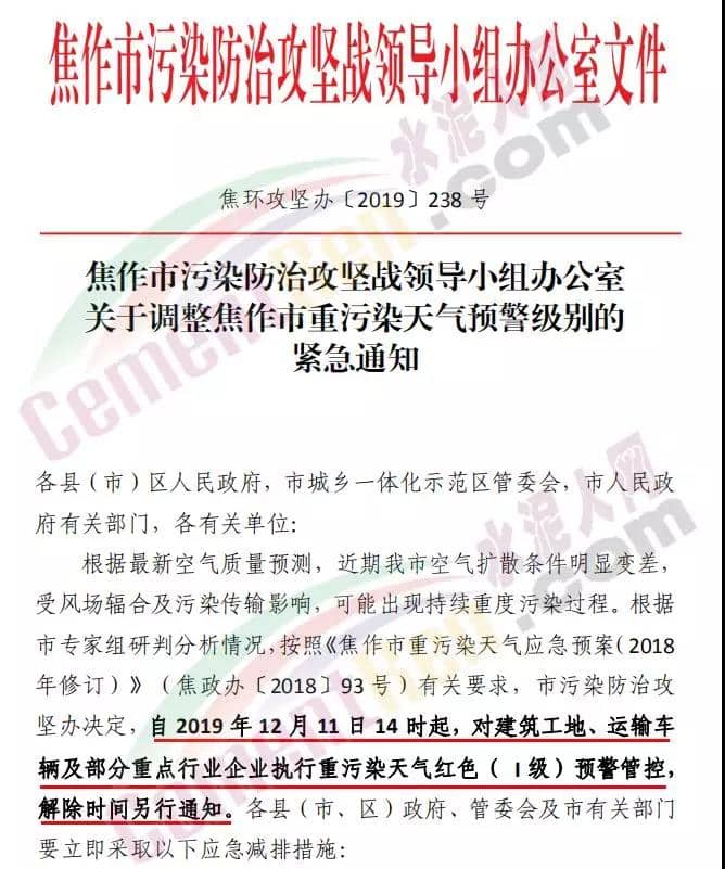 焦作市污染防治攻堅戰(zhàn)領導小組辦公室通知自12月11日14時起對建筑工地、運輸車輛及部分重點行業(yè)企業(yè)執(zhí)行重污染天氣紅色(I級)預警管控。通知要求執(zhí)行重污染天氣紅色( I 級)預警措施的水泥粉磨站企業(yè)為焦作堅固水泥有限公司、焦作千業(yè)水泥有限 責任公司、焦作市中晶水泥有限責任公司、焦作市賽雪白水泥有 限公司、博愛金隅水泥有限公司、沁陽市金隅水泥有限公司、焦作市鵬遠水泥有限公司、焦作市永石水泥廠、沁陽市太華建材有 限公司、焦作市丹陽水泥有限公司。同時,礦山停止作業(yè)。