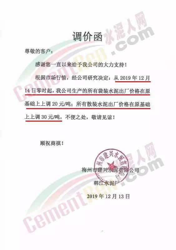 根據(jù)市場情況,經(jīng)研究,決定從2019年12月14日零時(shí)起,本公司發(fā)往福建省內(nèi)各品種各規(guī)格型號(hào)水泥在原價(jià)格基礎(chǔ)上上調(diào)30元/噸。