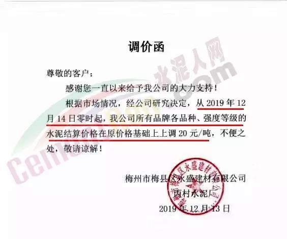 感謝您一直以來對我司的大力支持、根據(jù)目前市場行情,經(jīng)公司研究決定,自2019年12月14日6時(shí)起,我司發(fā)往各區(qū)域的全部品牌各規(guī)格袋、散裝水泥的出廠價(jià)格上調(diào)30元/噸。