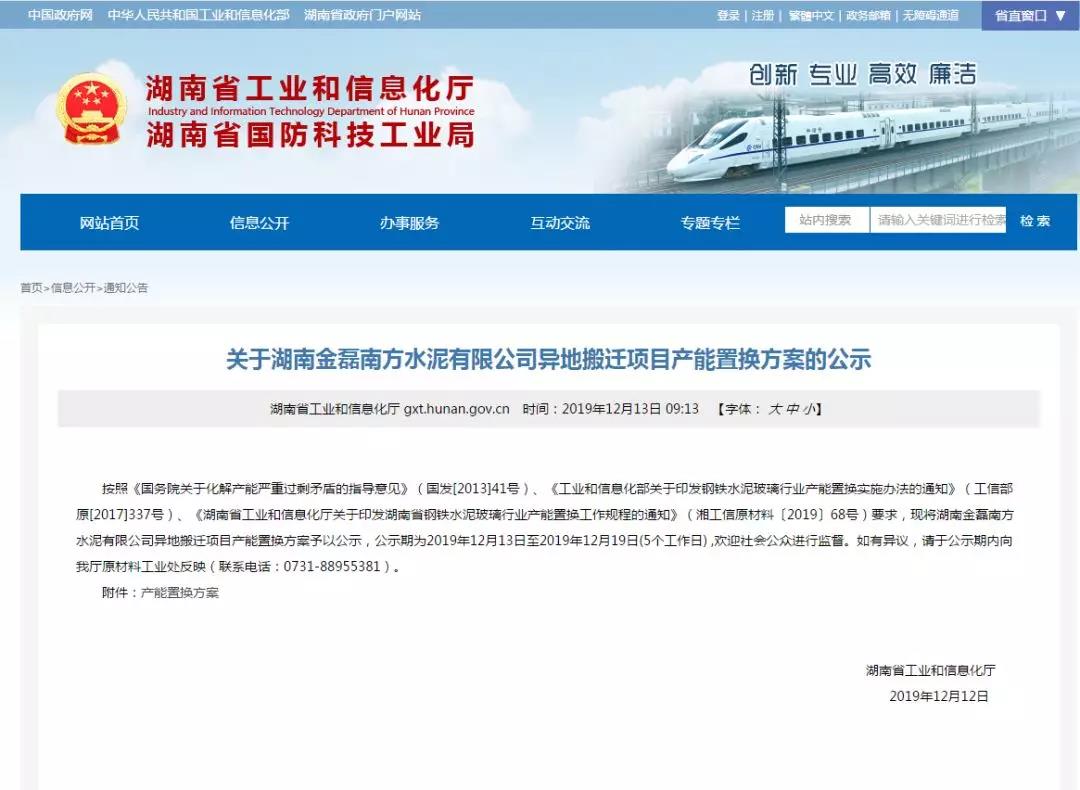 12月12日,湖南省工業(yè)和信息化廳公布了《關(guān)于湖南金磊南方水泥有限公司異地搬遷項(xiàng)目產(chǎn)能置換方案的公示》。