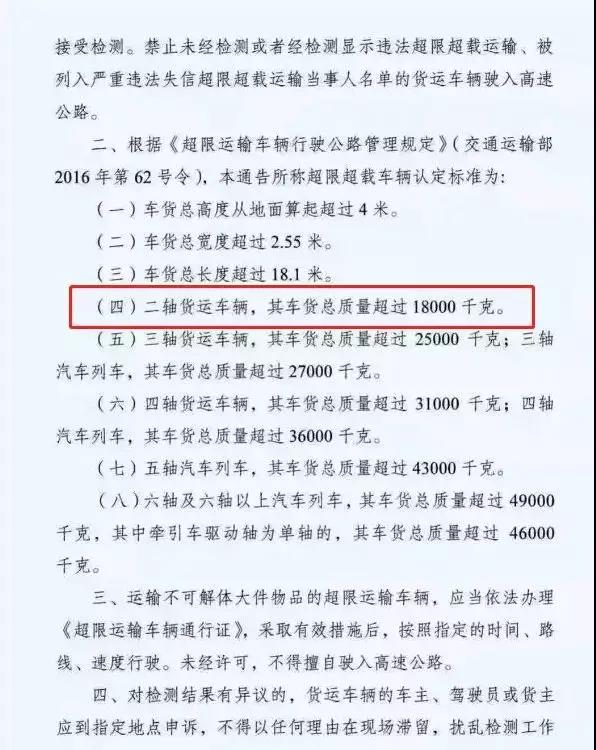 不僅如此,浙江、廣西和甘肅等交通運(yùn)輸廳發(fā)布的入口稱重通告里,對(duì)二軸車超載超限車輛認(rèn)定標(biāo)準(zhǔn)是:車貨總質(zhì)量超過18噸。全文件里并沒有額外說明二軸車要低于行駛證核載。