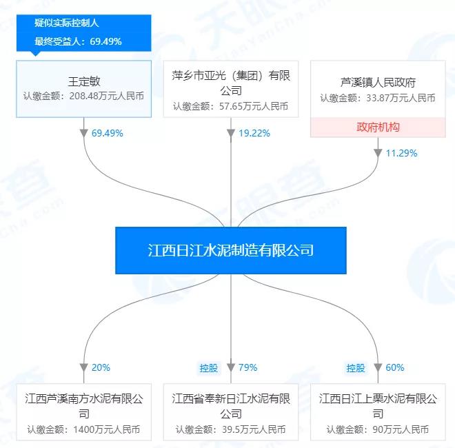 相關(guān)數(shù)據(jù)顯示江西日江水泥制造有限公司疑似實(shí)際控制人王定敏擁有企業(yè)69.49%的股份,為第一大股東;第二大股東為萍鄉(xiāng)市亞光(集團(tuán))有限公司,占股19.22%。第三大股東為蘆溪鎮(zhèn)人民政府,占股11.29%。