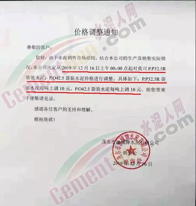 日前,河南省、廣東省及廣西壯族自治區(qū)部分區(qū)域企業(yè)通知上調(diào)水泥價格:華潤水泥通知自2019年12月17日零時起惠州地區(qū)全品種袋裝、散裝水泥價格上調(diào)20元/噸 。廣西合浦南珠水泥廠通知自2019年12月17日起,水泥價格上調(diào)30元每噸。茂名市油城牌水泥通知自12月16日0時起,P.P32.5R袋裝水泥,PO42.5袋裝水泥價格上調(diào)10元/噸。原陽縣同力水泥通知自12月16日中午12時起,PSA32.5R級、PO42.5級水泥在原執(zhí)行價格基礎上上調(diào)30元/噸。