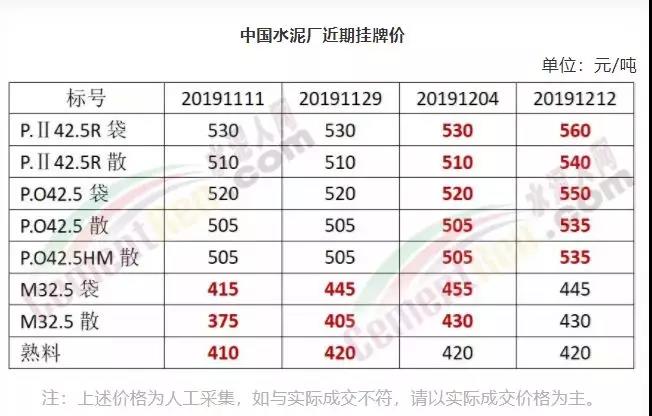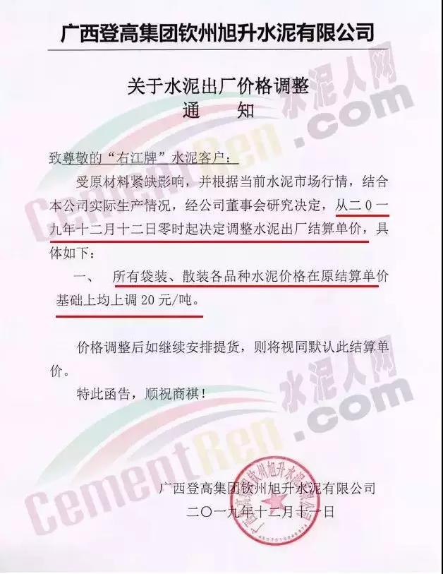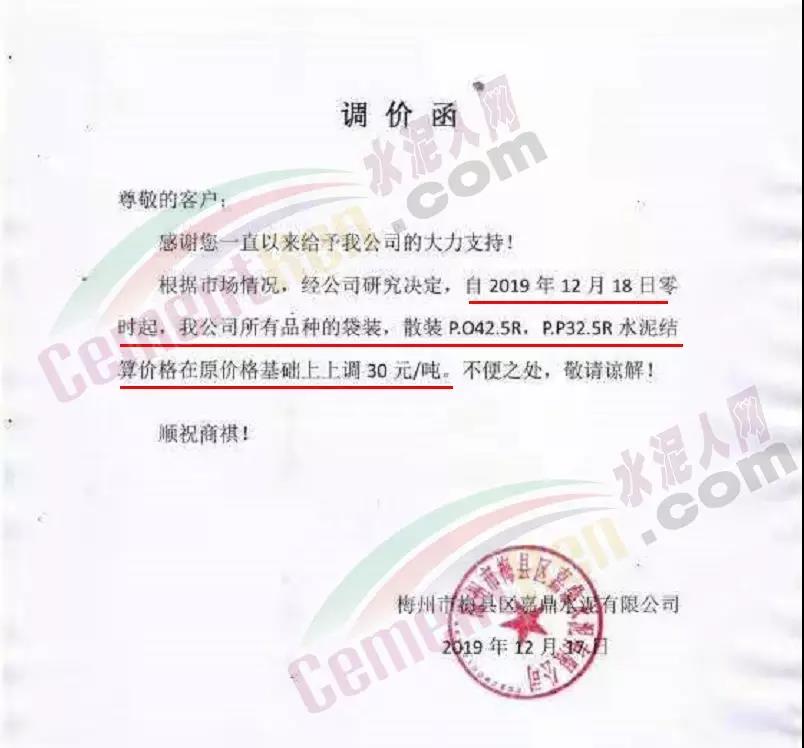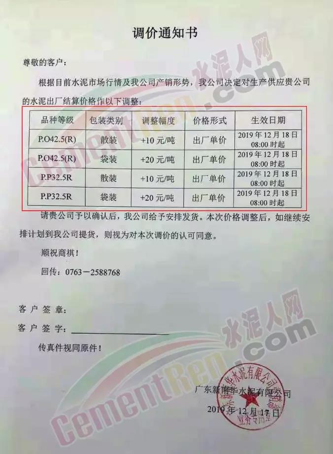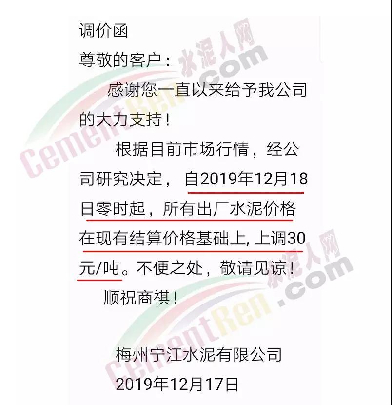 期中,梅州市塔牌營銷通知稱依照《水泥購銷合同》的約定,經(jīng)福建塔牌水泥有限公司授權通知及我公司研究決定,自2019年12月18日零時起,福建、梅州基地各廠所有水泥出廠結算價格在現(xiàn)行價格基礎上上調30元/噸。上周六(14日),這家企業(yè)剛剛通知福建、梅州各基地各廠所有散裝水泥出廠結算價格在現(xiàn)行價格基礎上上調40元/噸,所有袋裝水泥出廠結算價格在現(xiàn)行價格基礎上上調20元/噸。
