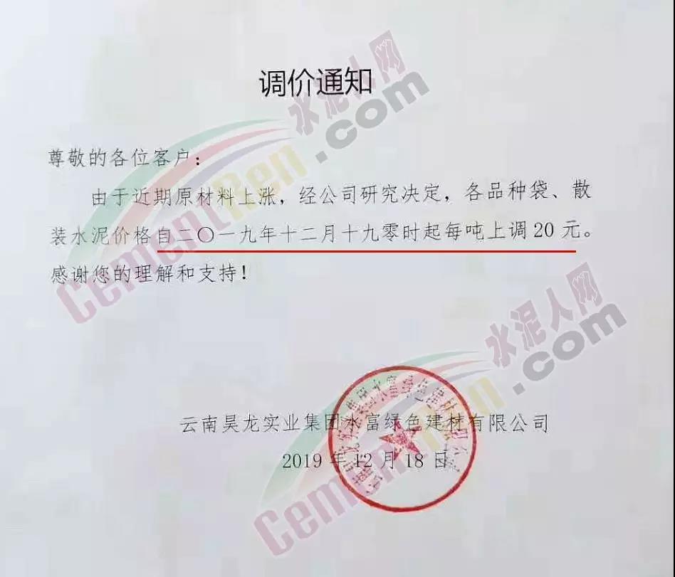 新一輪漲價開啟,西南區(qū)域四川、重慶、云南等多家水泥企業(yè)加入“漲價大軍”。其中云南昊龍實業(yè)集團水富綠色建材有限公司調(diào)價通知稱自今日(19日)零時起各品種袋、散裝水泥上調(diào)20元/噸。