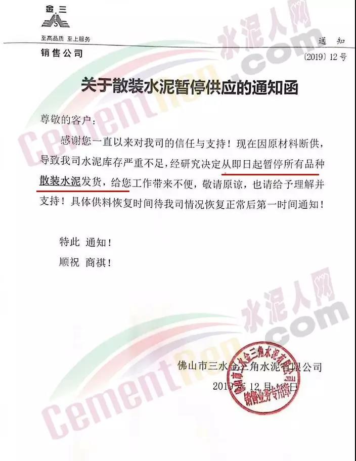 據(jù)了解,日前佛山市三水金三角水泥有限公司剛剛發(fā)布了散裝水泥停供通知。通知稱,因原材料斷供、導(dǎo)致公司水泥庫存嚴(yán)重不足,經(jīng)研究決定從即日起暫停所有品種散裝水泥。具體供料恢復(fù)時間等企業(yè)情況恢復(fù)正常后第一時間通知。