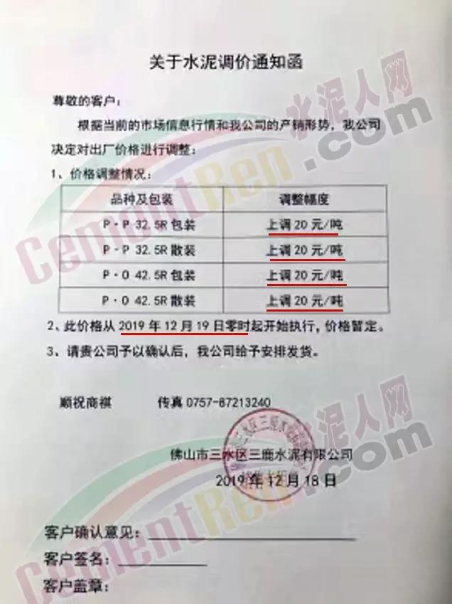佛山市三水區(qū)三鹿水泥調(diào)價通知稱自今日(19日)零時起各標(biāo)號水泥出廠價上調(diào)20元/噸。