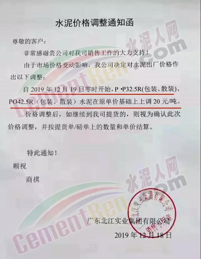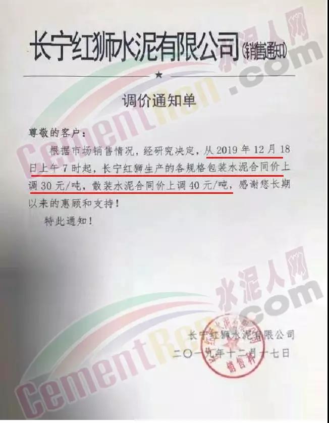 排隊船昨日(18日),四川區(qū)域各企業(yè)也通知上調(diào)水泥格30-40元/噸。其中長寧紅獅水泥調(diào)價通知稱,根據(jù)市場銷售情況,經(jīng)研究決定 從12月18日上午7時起,長寧紅獅生產(chǎn)的各規(guī)格包裝水泥合同價上調(diào)30元/噸,散裝水泥合同價上調(diào)40元/噸。