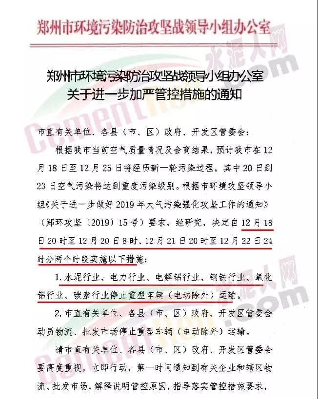 同期,鄭州市還發(fā)布了另一份文件要求自12月18日20時(shí)至12月20日8時(shí)、12月21日20時(shí)至12月22日24時(shí)分水泥行業(yè)、電力行業(yè)、電解鋁行業(yè)、鋼鐵行業(yè)、氧化鋁行業(yè)、碳素行業(yè)停止重型車輛(電動(dòng)除外)運(yùn)輸。