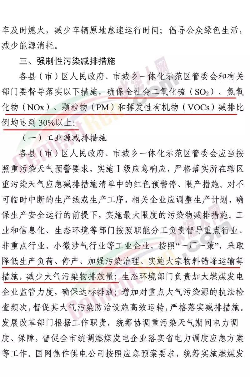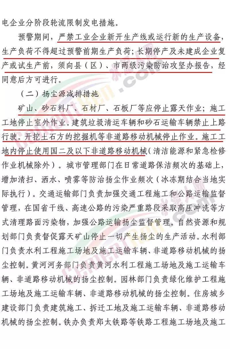 昨日(12月23日)河南省焦作市污染防治攻堅戰(zhàn)領導小組辦公室印發(fā)《關于將重污染天氣預警全面升級為紅色預警的 緊急通知》稱,焦作市自 2019 年 12 月 23 日 18 時起,將目前啟動的重污染天氣橙色預警(五城 區(qū)建筑工地及部分企業(yè)執(zhí)行紅色預警管控措施)全面升級為紅色預警,解除時間另行通知。工業(yè)源減排措施 各縣(市)區(qū)人民政府、市城鄉(xiāng)一體化示范區(qū)管委會應當按照重污染天氣預警要求,實施Ⅰ級應急響應,嚴格落實所在轄區(qū)重污染天氣應急減排措施清單中的紅色預警停、限產措施。對不可臨時中斷的生產線或生產工序,相關企業(yè)應調整生產計劃,確 保生產安全運行的前提下,實施最大限度的污染物減排措施。工業(yè)和信息化、生態(tài)環(huán)境等部門按照職能分工負責督導重點行業(yè)、 非重點行業(yè)、小微涉氣行業(yè)等工業(yè)企業(yè),按照“一廠一策”,采取 降低生產負荷、停產、加強污染治理、實施大宗物料錯峰運輸等 措施,減少大氣污染物排放量。預警期間,嚴禁工業(yè)企業(yè)新開生產線或運行新的生產設備, 生產負荷不得超過預警前期生產負荷;長期停產及未建成企業(yè)復 產或試生產前,須向縣(區(qū))、市兩級污染防治攻堅辦報告,經同意后方可進行。揚塵源減排措施 礦山、砂石料廠、石材廠、石板廠等應停止露天作業(yè);施工 工地停止室外作業(yè)。建筑垃圾清運車輛和砂石運輸車輛禁止上路行駛。開挖土石方的挖掘機等非道路移動機械停止作業(yè)。通知原文如下: