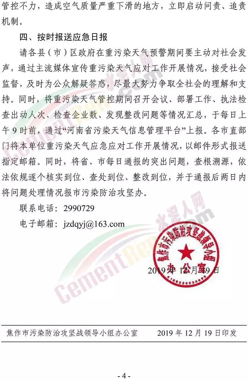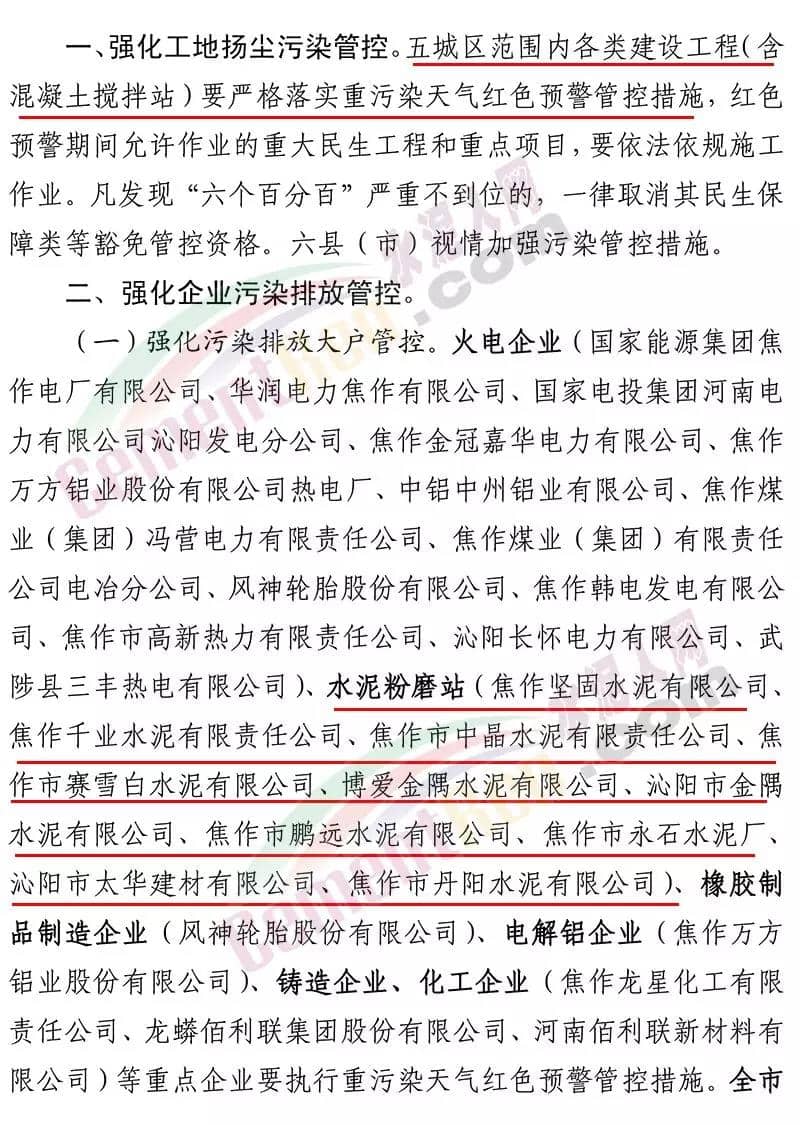 據了解,12 月 19 日焦作市污染防治攻堅戰(zhàn)領導小組辦公室 曾發(fā)布《關于加強 12 月 20 日至 25 日重污染天氣預警 應急應對工作的緊急通知》要求在全市執(zhí)行重污染天氣橙色預警管控措施的 基礎上,自 2019 年 12 月 20 日 14 時至 2019 年 12 月 25 日 24 時, 采取以下強化管控措施強化工地揚塵污染管控。五城區(qū)范圍內各類建設工程(含混凝土攪拌站)要嚴格落實重污染天氣紅色預警管控措施,紅色預警期間允許作業(yè)的重大民生工程和重點項目,要依法依規(guī)施工作業(yè)。強化污染排放大戶管控。水泥粉磨站(焦作堅固水泥有限公司、 焦作千業(yè)水泥有限責任公司、焦作市中晶水泥有限責任公司、焦作市賽雪白水泥有限公司、博愛金隅水泥有限公司、沁陽市金隅水泥有限公司、焦作市鵬遠水泥有限公司、焦作市永石水泥廠、 沁陽市太華建材有限公司、焦作市丹陽水泥有限公司)。全市所有礦山企業(yè)停止作業(yè)。強化運輸大戶污染管控。全市煤炭、鋼鐵、電解鋁、 電力、建材、水泥、碳素、化工、礦山等大型工礦企業(yè)原則上停止公路貨運車輛運輸(涉及生產安全、污染防治設施穩(wěn)定運行等 保障車輛除外),要加強無組織排放管控,有鐵路專用線的要提高鐵路運輸運力。對其他工業(yè)企業(yè),各縣(市)區(qū)視情加強污染 管控措施。通知原文如下: