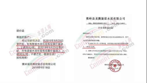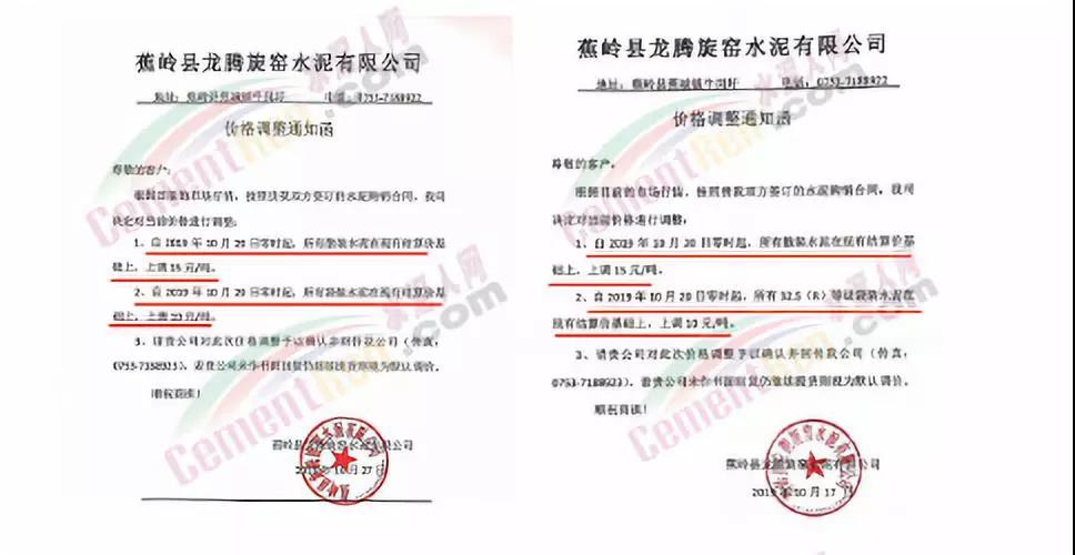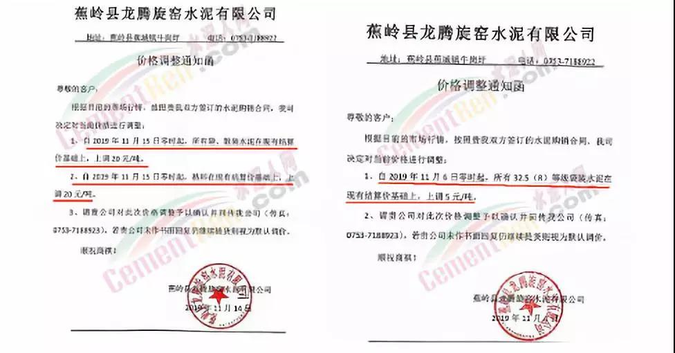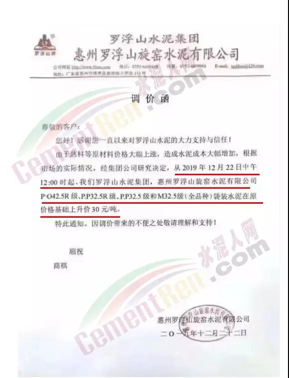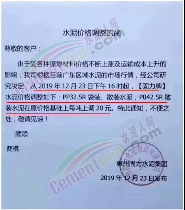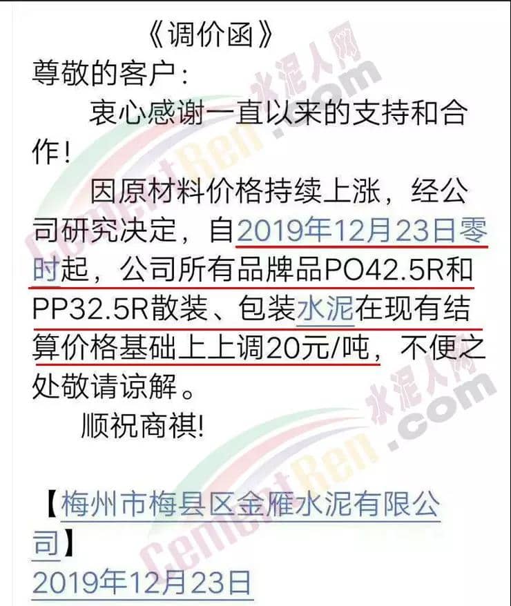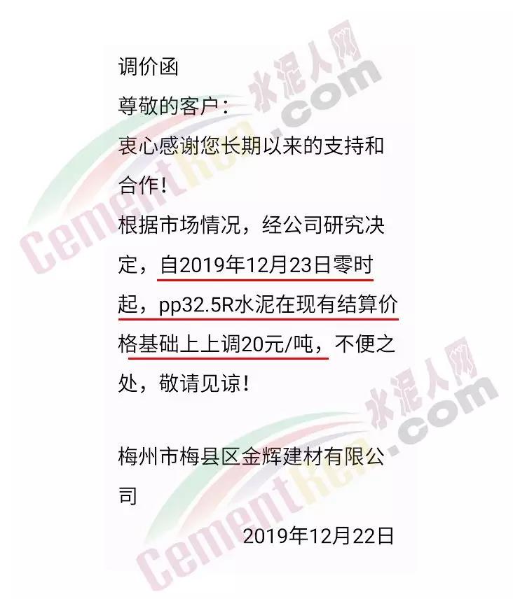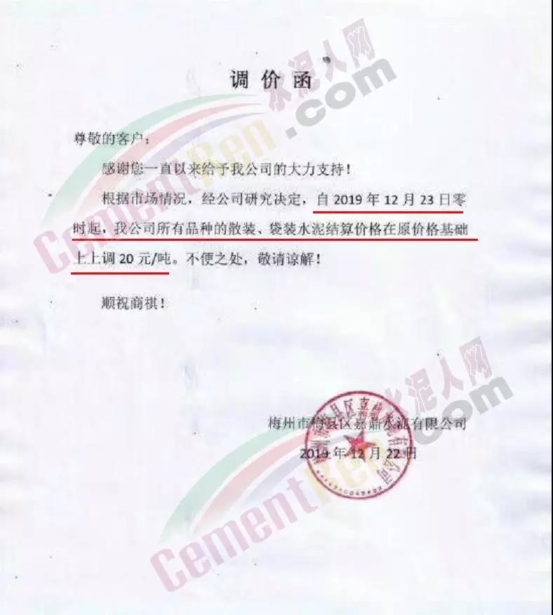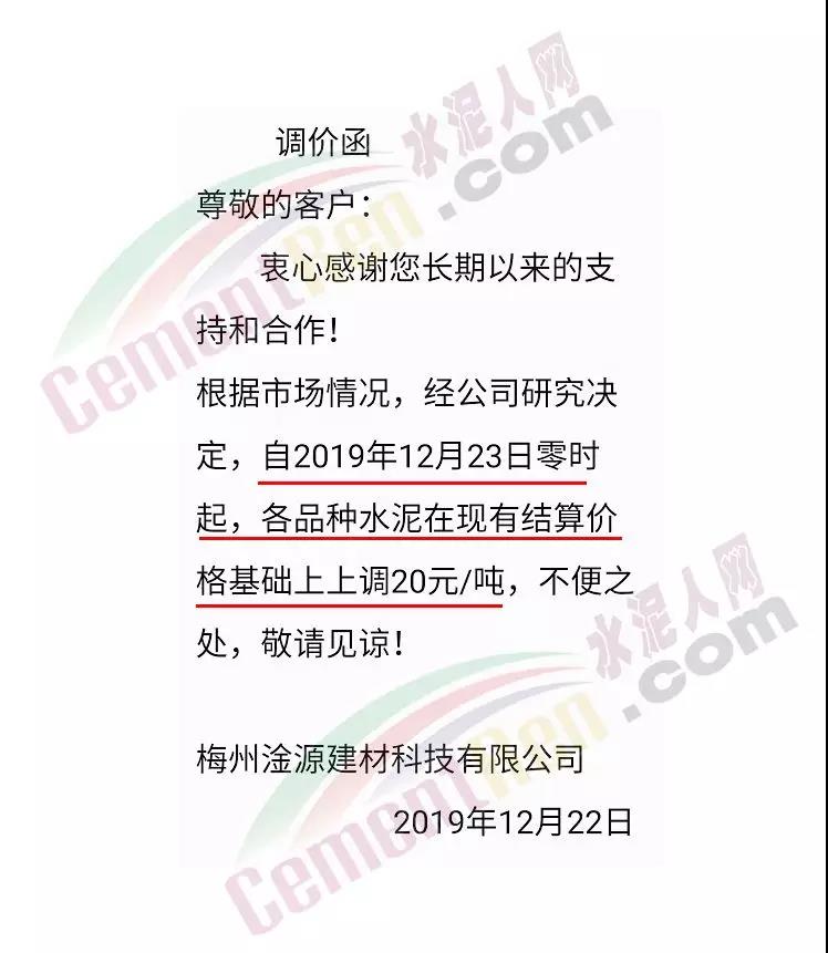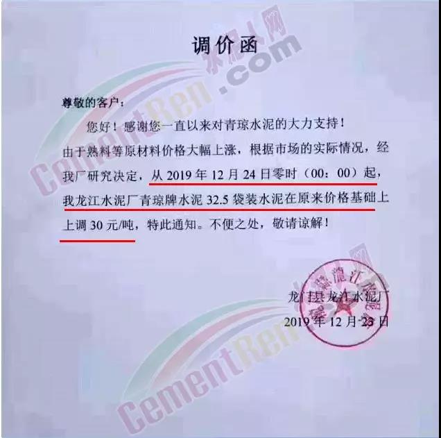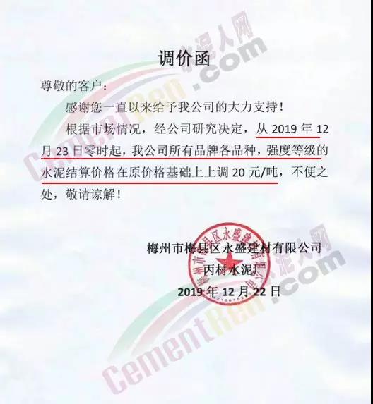 漲價(jià)通知尊敬的客戶,由于環(huán)保管控及近期原材料價(jià)格不斷上漲, 結(jié)合我公司的實(shí)際情況,經(jīng)公司領(lǐng)導(dǎo)研究決定:自2019年12月19日下午5點(diǎn)起,公司PF 32.5級水泥執(zhí)行價(jià)格在原價(jià)基礎(chǔ)上上調(diào)20元/噸,望廣大客戶諒解和支持!(****水泥有限公司2019年12月19日)