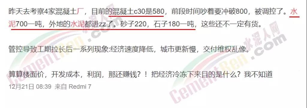 不久前,鄭州某施工企業(yè)向水泥人網(wǎng)反映,考察了四家混凝土廠,C30混凝土的最低價(jià)是580元,前段時(shí)間吵著要沖破800,被調(diào)控了。水泥價(jià)格沖高760元/噸,貴州、四川、內(nèi)蒙、山西、陜西多個(gè)省自治區(qū)的水泥都進(jìn)鄭州了。目前,砂子220元,石子180元,這些價(jià)高還不一定有貨。重污染天氣管控工地停工,工期拉長,部分項(xiàng)目出現(xiàn)了交付維權(quán)現(xiàn)象。算算樓面價(jià)、開發(fā)成本、利潤,承包商大喊不賺錢。