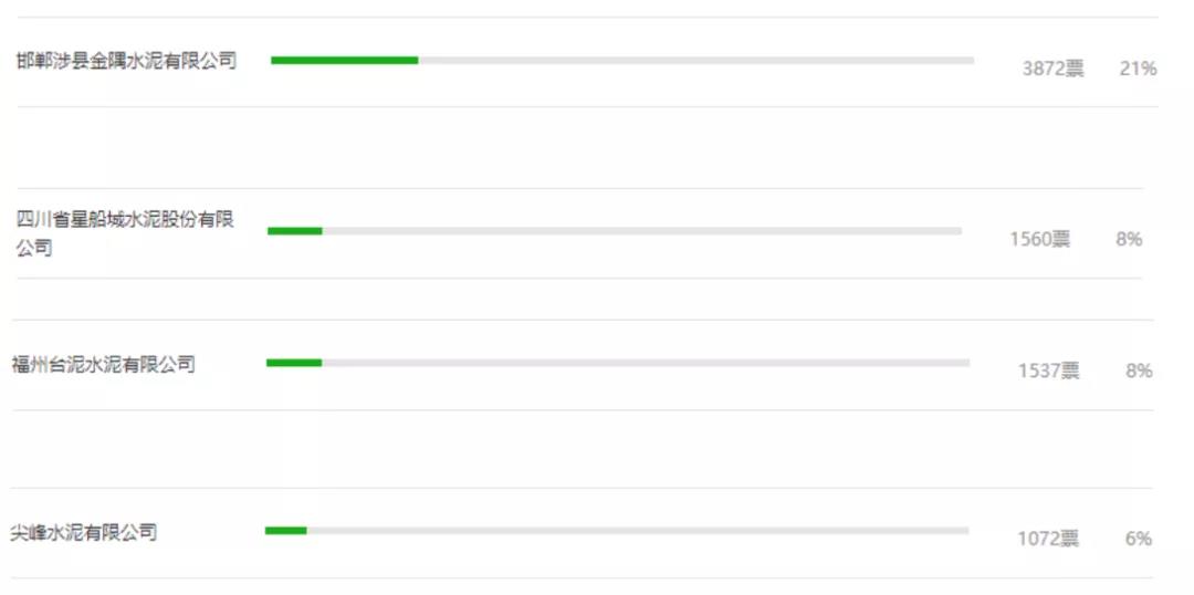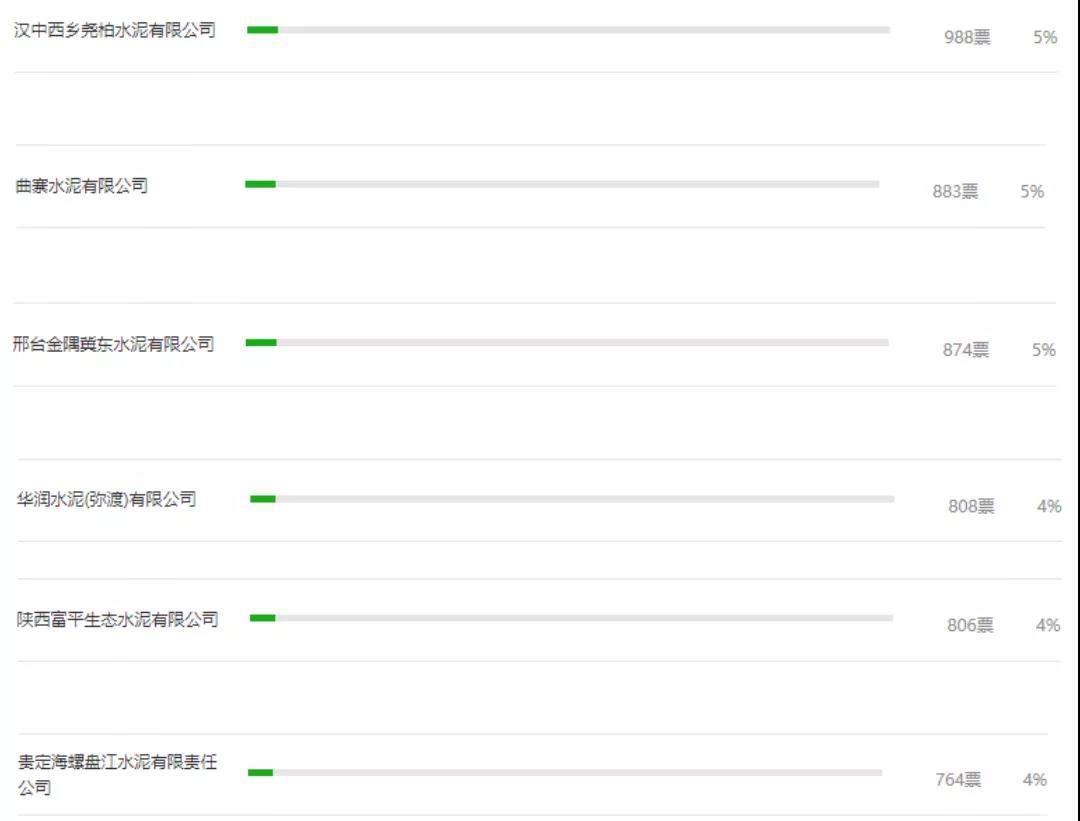 一、邯鄲涉縣金隅水泥3872票。二、四川星船城水泥股份有限公司1560票。三、福州臺泥水泥有限公司位居前三位1537票。四、尖峰水泥1072票。五、漢中西鄉(xiāng)堯柏水泥有限公司988票。六、曲寨水泥有限公司883票。七、邢臺金隅冀東水泥有限公司874票。八、華潤水泥(彌渡)有限公司808票。九、陜西富平生態(tài)水泥有限公司806票。十、貴定海螺盤江水泥有限責任公司764票。