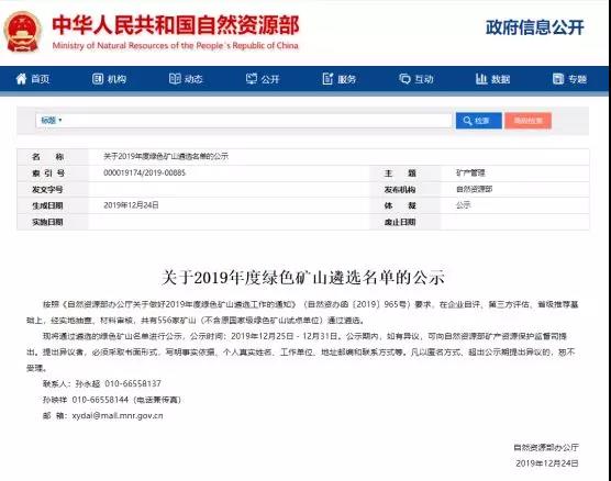 日前,國家自然資源部發(fā)布《關于2019年度綠色礦山遴選名單的公示》稱:按照《自然資源部辦公廳關于做好2019年度綠色礦山遴選工作的通知》(自然資辦函〔2019〕965號)要求,在企業(yè)自評、第三方評估、省級推薦基礎上,經(jīng)實地抽查、材料審核,共有556家礦山(不含原國家級綠色礦山試點單位)通過遴選。并將通過遴選的綠色礦山名單進行公示,公示時間:2019年12月25日-12月31日。公示原文如下: