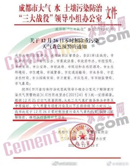 12月25日,四川省成都市大氣水土壤污染防治三大戰(zhàn)役領導小組辦公室發(fā)布了《關于12月26日零時解除重污染天氣黃色預警的通知》稱,成都市定于12月26日零時解除重污染天氣黃色預警,預警正式解除前,繼續(xù)執(zhí)行各項應急措施。通知原文如下0: