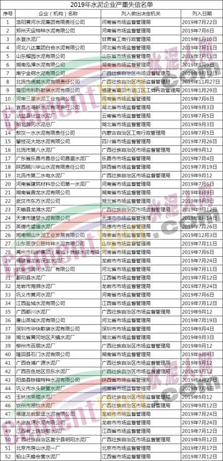 近些年來,失信行為并不少見,各行各業(yè)都存在嚴重失信行為,水泥行業(yè)也有不少企業(yè)存在嚴重失信行為,大多數(shù)都是一些小型企業(yè)。日前,水泥人網(wǎng)從國家企業(yè)信用信息公示系統(tǒng)獲悉,據(jù)不完全統(tǒng)計,2019年高達52家水泥企業(yè)被列入了嚴重違法失信企業(yè)名單(即“黑名單”),其中名單如下: