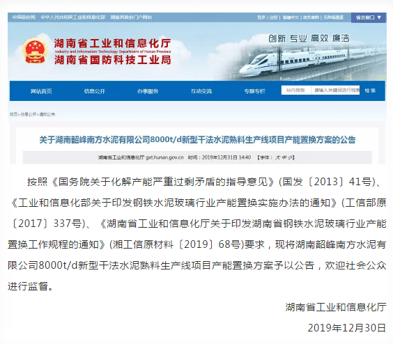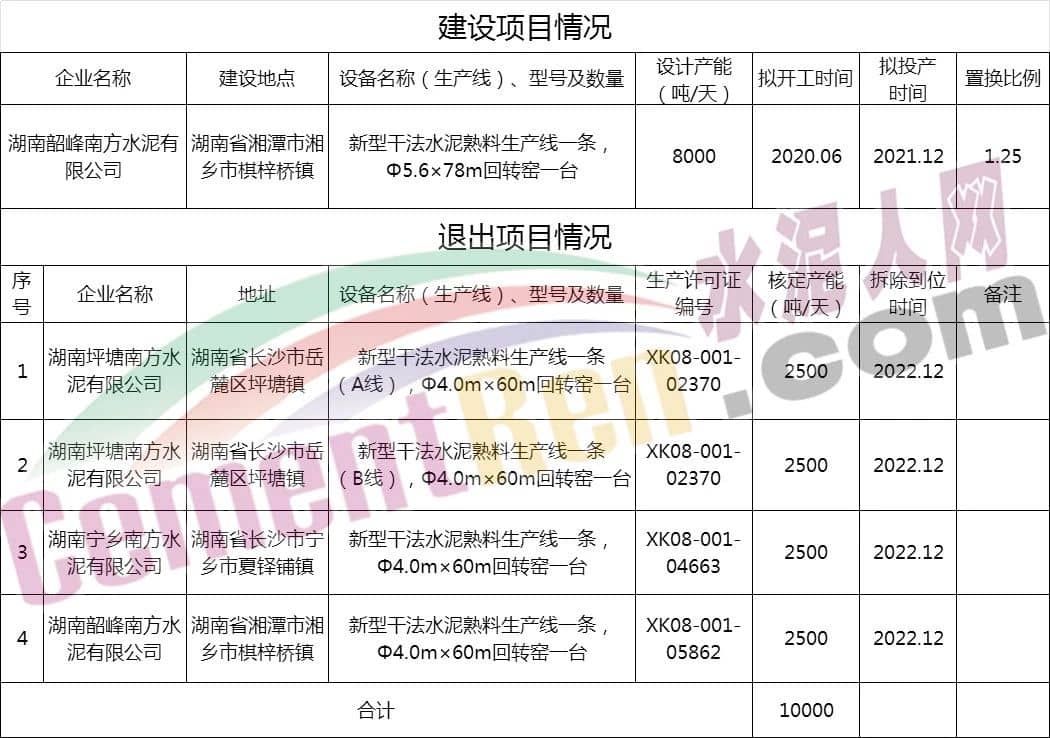 昨日(12月31日),湖南省工業(yè)和信息化廳發(fā)布了《關(guān)于湖南韶峰南方水泥有限公司8000t/d新型干法水泥熟料生產(chǎn)線項目產(chǎn)能置換方案的公告》,原文如下: 產(chǎn)能置換方案如下: 上述方案顯示,湖南韶峰南方水泥有限公司將在湖南省湘潭市湘鄉(xiāng)市棋梓橋鎮(zhèn)擬建一條日產(chǎn)8000噸熟料生產(chǎn)線(Φ5.6×78m回轉(zhuǎn)窯),擬2020年6月開工,2021年12月投產(chǎn)。