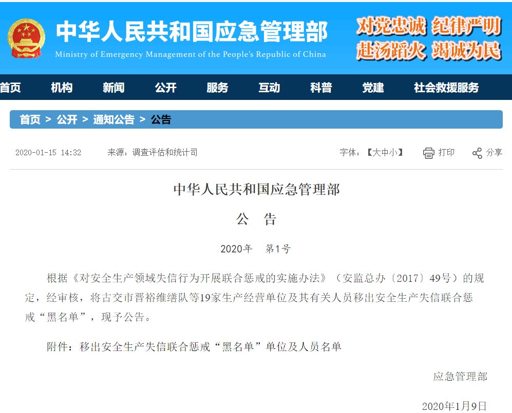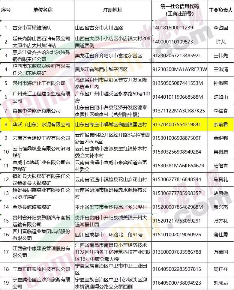 日前國家應(yīng)急管理部發(fā)布2020年第1號公告稱,根據(jù)《對安全生產(chǎn)領(lǐng)域失信行為開展聯(lián)合懲戒的實施辦法》(安監(jiān)總辦〔2017〕49號)的規(guī)定,經(jīng)審核,將古交市晉裕維繕隊等19家生產(chǎn)經(jīng)營單位及其有關(guān)人員移出安全生產(chǎn)失信聯(lián)合懲戒“黑名單”,并予公告。移出安全生產(chǎn)失信聯(lián)合懲戒“黑名單”的19家生產(chǎn)經(jīng)營單位中包括位于山東省棗莊市嶧城區(qū)榴園鎮(zhèn)匡四村華沃(山東)水泥有限公司。