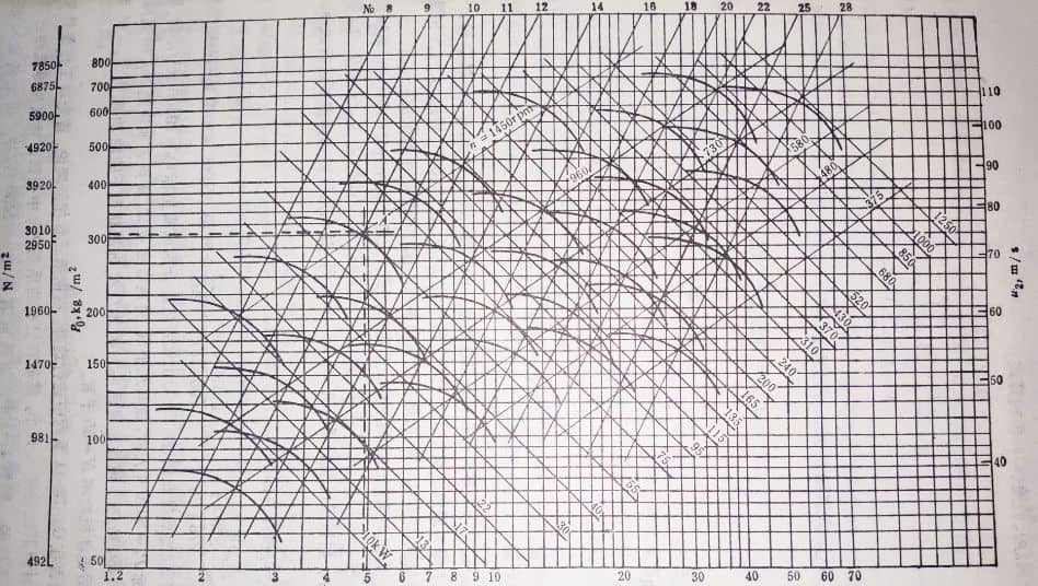 所謂型譜(圖1為鍋爐引風(fēng)機(jī)系列型譜)是對于不同的風(fēng)機(jī)運(yùn)行參數(shù)有對應(yīng)模型機(jī)與之對應(yīng),這樣才能保證風(fēng)機(jī)的設(shè)計(jì)符合風(fēng)機(jī)的實(shí)際工況。若找不到相對應(yīng)的風(fēng)力模型,風(fēng)機(jī)設(shè)計(jì)就沒有理論數(shù)據(jù)支撐。一般的風(fēng)機(jī)廠家會選擇在相近的風(fēng)力模型中進(jìn)行替代設(shè)計(jì),實(shí)際運(yùn)行工況與設(shè)計(jì)工況有較大的偏差。導(dǎo)致風(fēng)機(jī)實(shí)際運(yùn)行效率偏低。