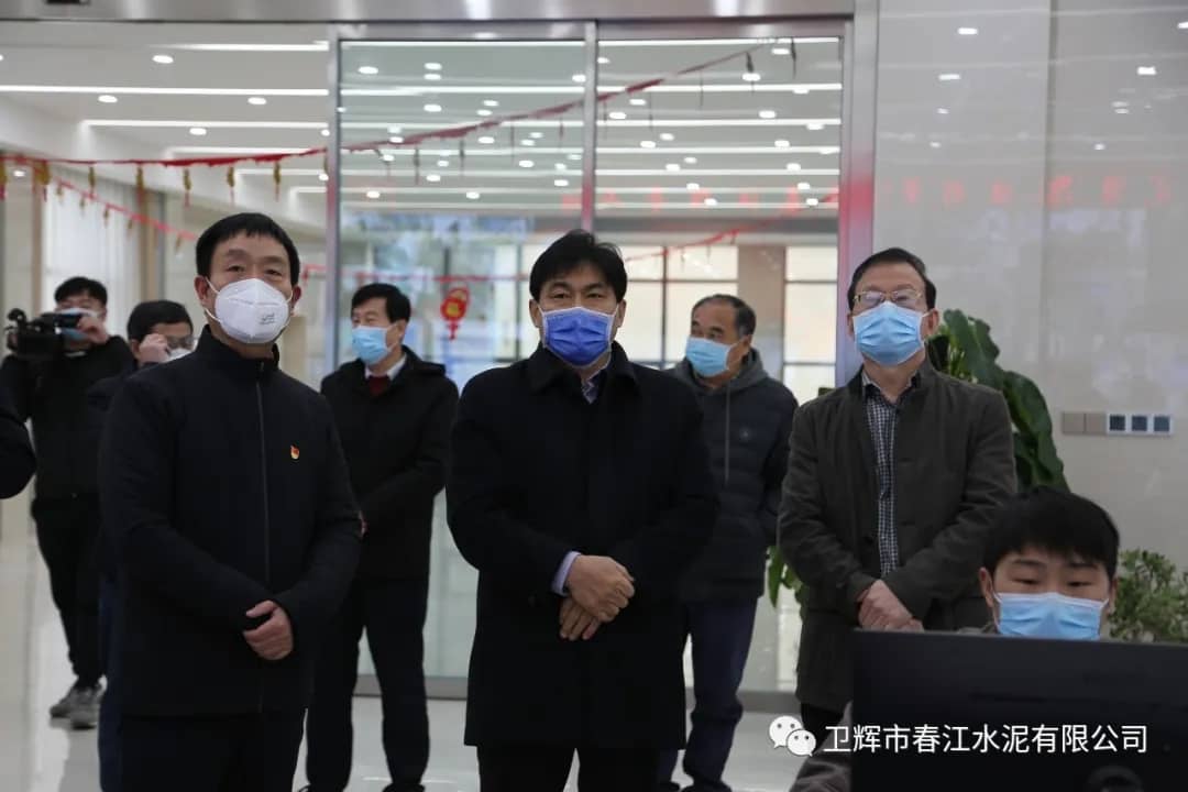 ▲新鄉(xiāng)市委書記張國偉一行在水泥公司中控室聽取裴春亮?xí)洀?fù)工復(fù)產(chǎn)情況匯報