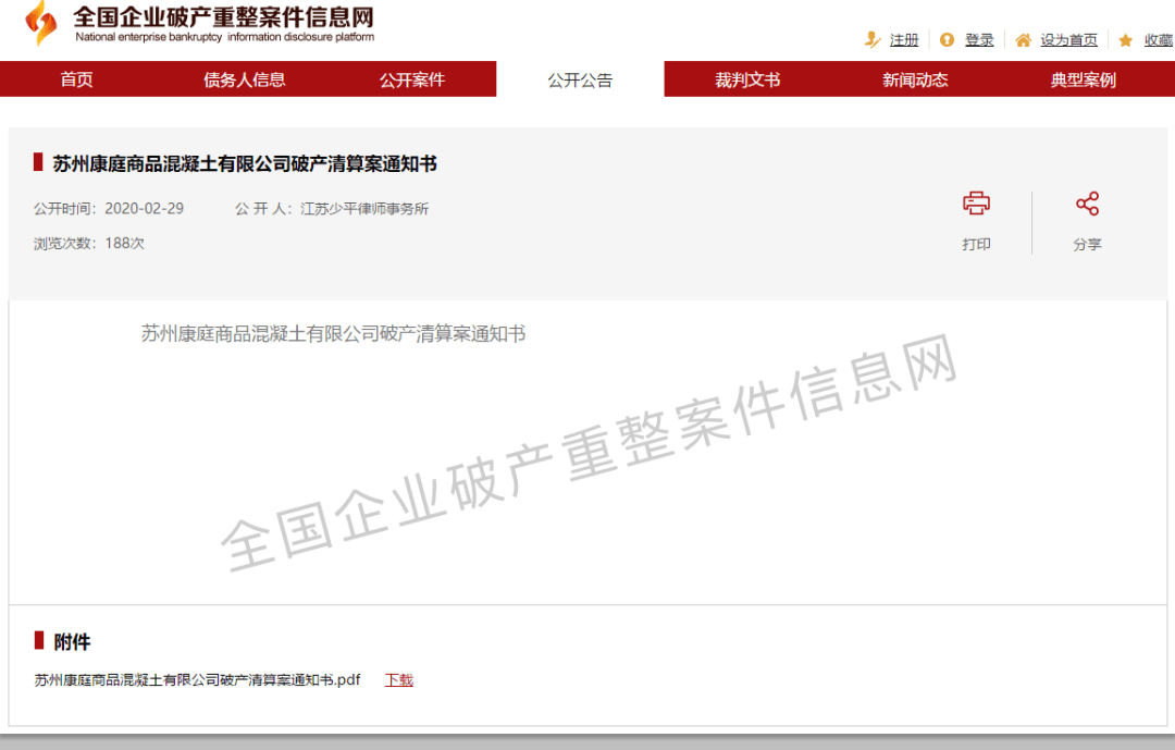 通知書(shū)稱(chēng):根據(jù)朱進(jìn)的申請(qǐng)于2019年12月19日裁定受理蘇州康庭商品混凝土有限公司破產(chǎn)清算一案 ,并指定律所擔(dān)任其管理人。蘇州康庭商品混凝土有限公司的債權(quán)人自公告之日起45日內(nèi)可申請(qǐng)債權(quán)。