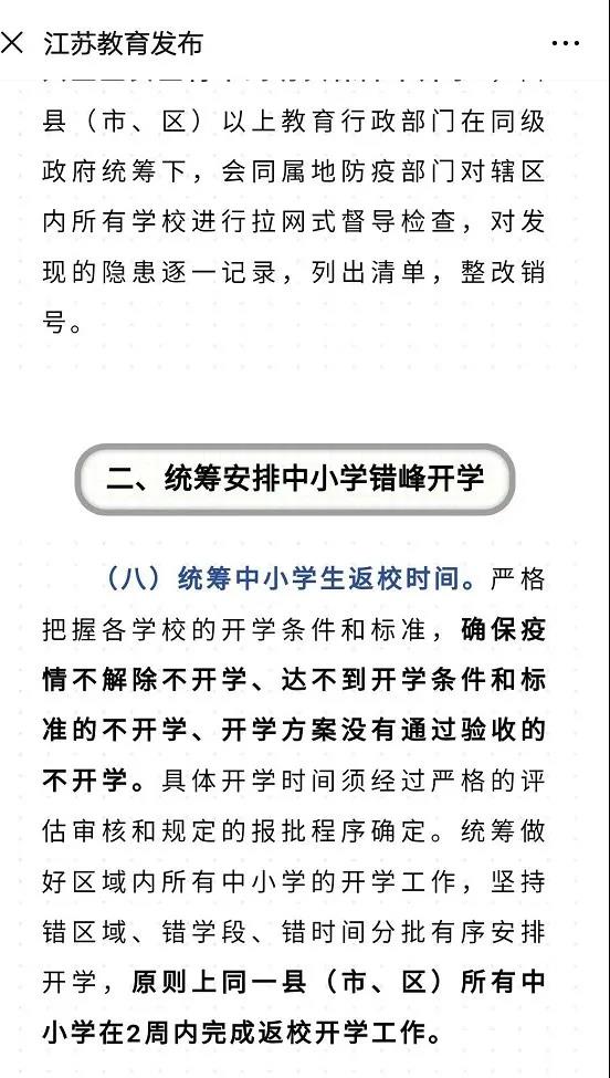 隨即,江蘇省教育廳發(fā)布了通知:原則上同一地縣(市、區(qū))所有中小學(xué)在兩周內(nèi)完成返校開(kāi)學(xué)工作!