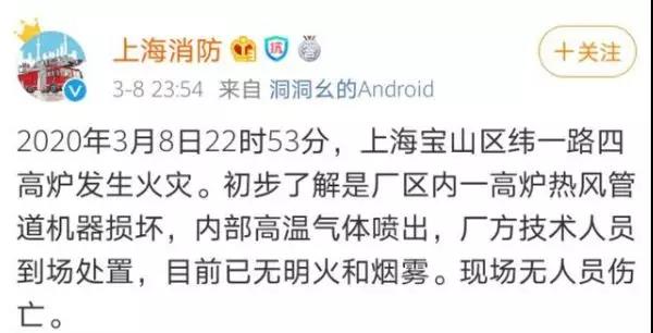 據(jù)上海消防通報,2020年3月8日22時53分,上海寶山區(qū)緯一路四高爐發(fā)生火災(zāi)。初步了解是廠區(qū)內(nèi)一高爐熱風(fēng)管道機器損壞,內(nèi)部高溫氣體噴出,廠方技術(shù)人員到場處置,目前已無明火和煙霧?,F(xiàn)場無人員傷亡。