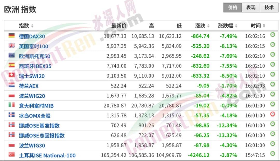 歐美股市也遭遇壓力,歐洲股市開盤全線暴跌,德國DAX指數(shù)跌超7%;英國富時100跌超8%;盤前美股標普500、道瓊斯30股指期貨跌幅超4%。