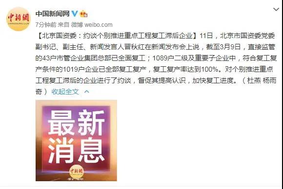 3月11日,北京市國(guó)資委黨委副書記、副主任、新聞發(fā)言人晉秋紅在新聞發(fā)布會(huì)上說,截至3月9日,直接監(jiān)管的43戶市管企業(yè)集團(tuán)總部已全面復(fù)工;1089戶二級(jí)及重要子企業(yè)中,符合復(fù)工復(fù)產(chǎn)條件的1019戶企業(yè)已全部復(fù)工復(fù)產(chǎn),復(fù)工復(fù)產(chǎn)率達(dá)到100%。對(duì)個(gè)別推進(jìn)重點(diǎn)工程復(fù)工滯后的企業(yè)進(jìn)行了約談,督促其提高認(rèn)識(shí),加快復(fù)工進(jìn)度。