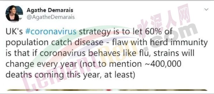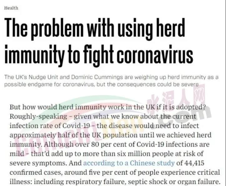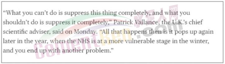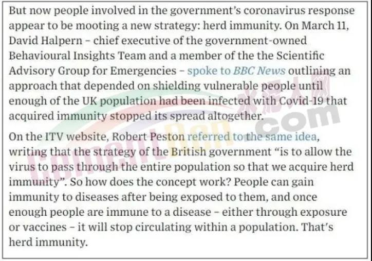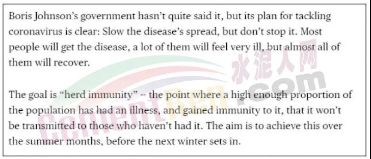 在一篇名為“鮑里斯·約翰遜的英國(guó)病毒防疫策略,是讓人們都去感染病毒”的報(bào)道中,彭博社就表示:雖然約翰遜的政府沒有明著說出“讓所有人都去得病”這句話,但他們策略中的這個(gè)意圖已經(jīng)很明顯了,即要放緩病毒的傳播,但并不是去完全控制這個(gè)病毒,讓人們?cè)诮衲晗募韭厝ジ腥?,然后逐漸康復(fù),進(jìn)而在冬天之前達(dá)到“人群免疫”(herd immunity)的目標(biāo)。