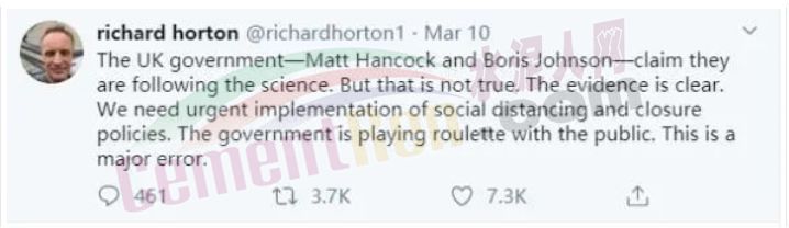 言辭更激烈的是國(guó)際權(quán)威醫(yī)學(xué)期刊《柳葉刀》的主編Richard Horton,稱英國(guó)政府的決策并不是依據(jù)科學(xué)做出的,而是在拿公眾的安危玩兒“輪盤賭注”,是個(gè)重大的錯(cuò)誤。