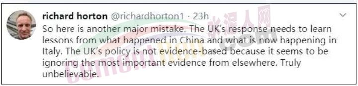他還認(rèn)為英國(guó)必須學(xué)習(xí)中國(guó)和意大利的經(jīng)驗(yàn)教訓(xùn),而不是忽視這些重要的證據(jù)。