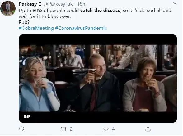還有英國(guó)網(wǎng)民苦中作樂地調(diào)侃說:80%的人都會(huì)感染病毒?那我們啥都不用做了,就等著一切都暴發(fā)起來吧~去酒吧不?