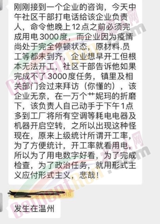 某企業(yè)負(fù)責(zé)人透露:社區(qū)干部打電話給該企業(yè)負(fù)責(zé)人,要求他晚上12點之前必須完成3000度電的用電任務(wù),不能打折扣!