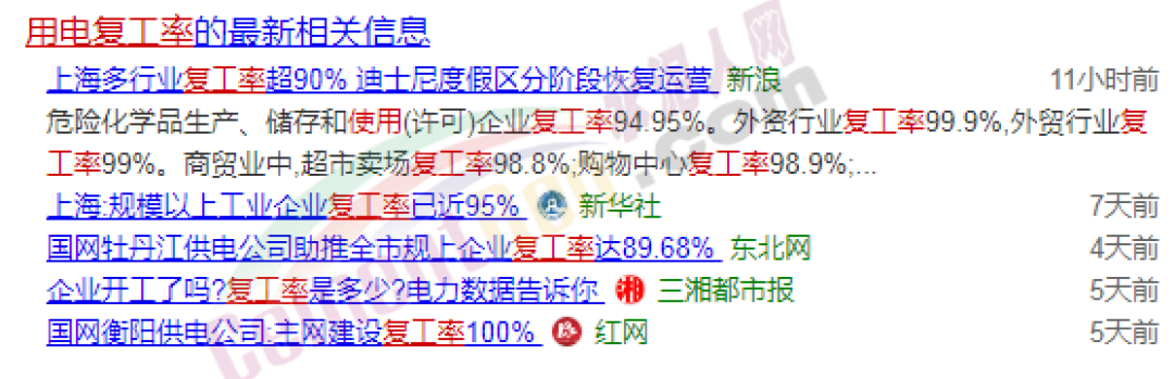 用電量是統(tǒng)計復(fù)工率的重要指標(biāo)。水泥人網(wǎng)搜了一下“用電”、“復(fù)工”的新聞,發(fā)現(xiàn)各地都有用用電量計算復(fù)工率。