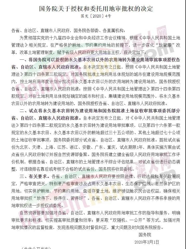 國(guó)務(wù)院日前印發(fā)《關(guān)于授權(quán)和委托用地審批權(quán)的決定》(以下簡(jiǎn)稱《決定》)明確國(guó)務(wù)院可以授權(quán)的永久基本農(nóng)田以外的農(nóng)用地轉(zhuǎn)為建設(shè)用地審批事項(xiàng)授權(quán)各省、自治區(qū)、直轄市人民政府批準(zhǔn)。按照土地管理法第四十四條第三款規(guī)定,對(duì)國(guó)務(wù)院批準(zhǔn)土地利用總體規(guī)劃的城市在建設(shè)用地規(guī)模范圍內(nèi),按土地利用年度計(jì)劃分批次將永久基本農(nóng)田以外的農(nóng)用地轉(zhuǎn)為建設(shè)用地的,國(guó)務(wù)院授權(quán)各省、自治區(qū)、直轄市人民政府批準(zhǔn);按照土地管理法第四十四條第四款規(guī)定,對(duì)在土地利用總體規(guī)劃確定的城市和村莊、集鎮(zhèn)建設(shè)用地規(guī)模范圍外,將永久基本農(nóng)田以外的農(nóng)用地轉(zhuǎn)為建設(shè)用地的,國(guó)務(wù)院授權(quán)各省、自治區(qū)、直轄市人民政府批準(zhǔn)。
