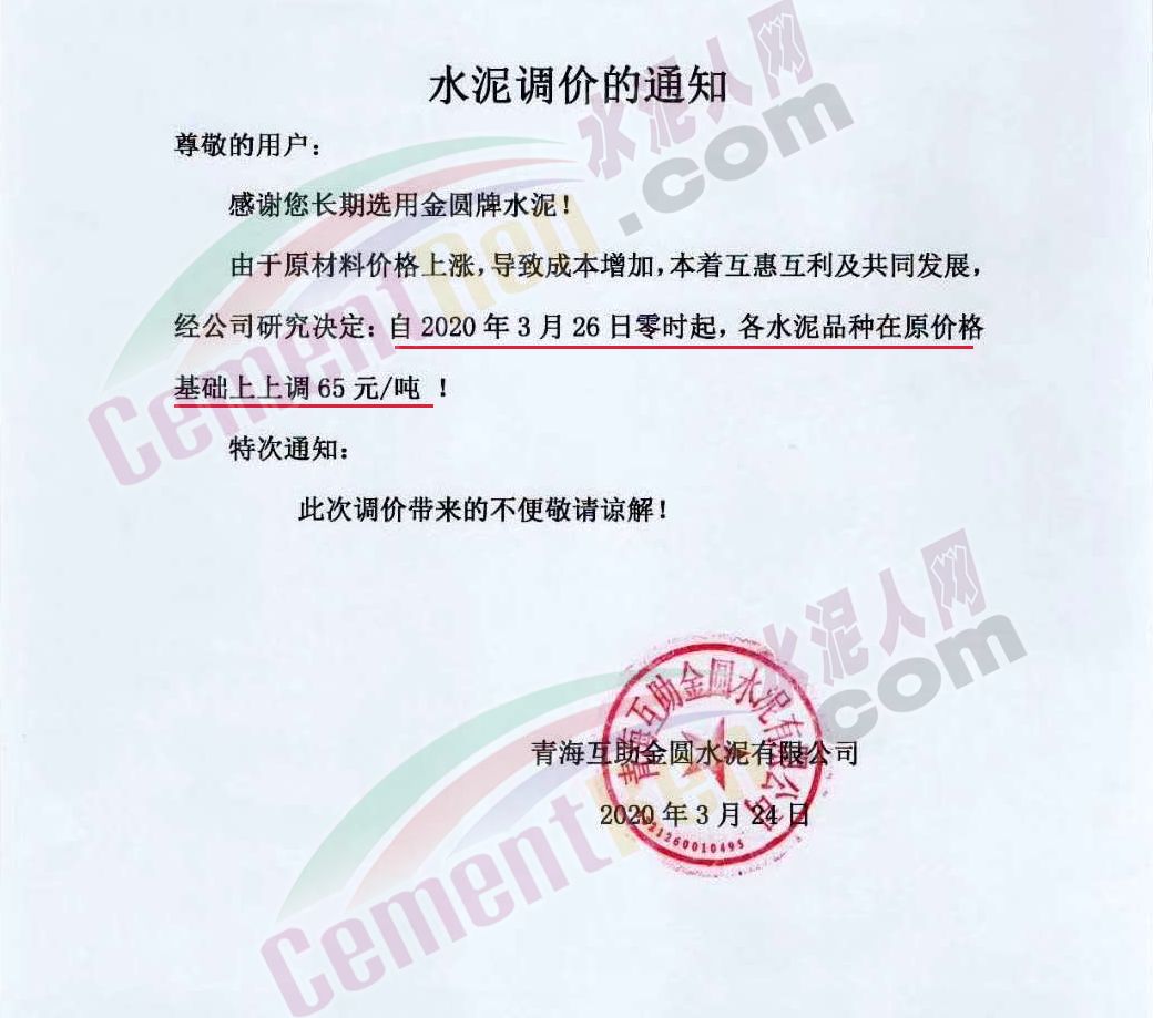 日前,青?;ブ饒A水泥有限公司通知將自3月26日零時起上調(diào)水泥價格,各品種在原價格基礎上上調(diào)65元/噸。