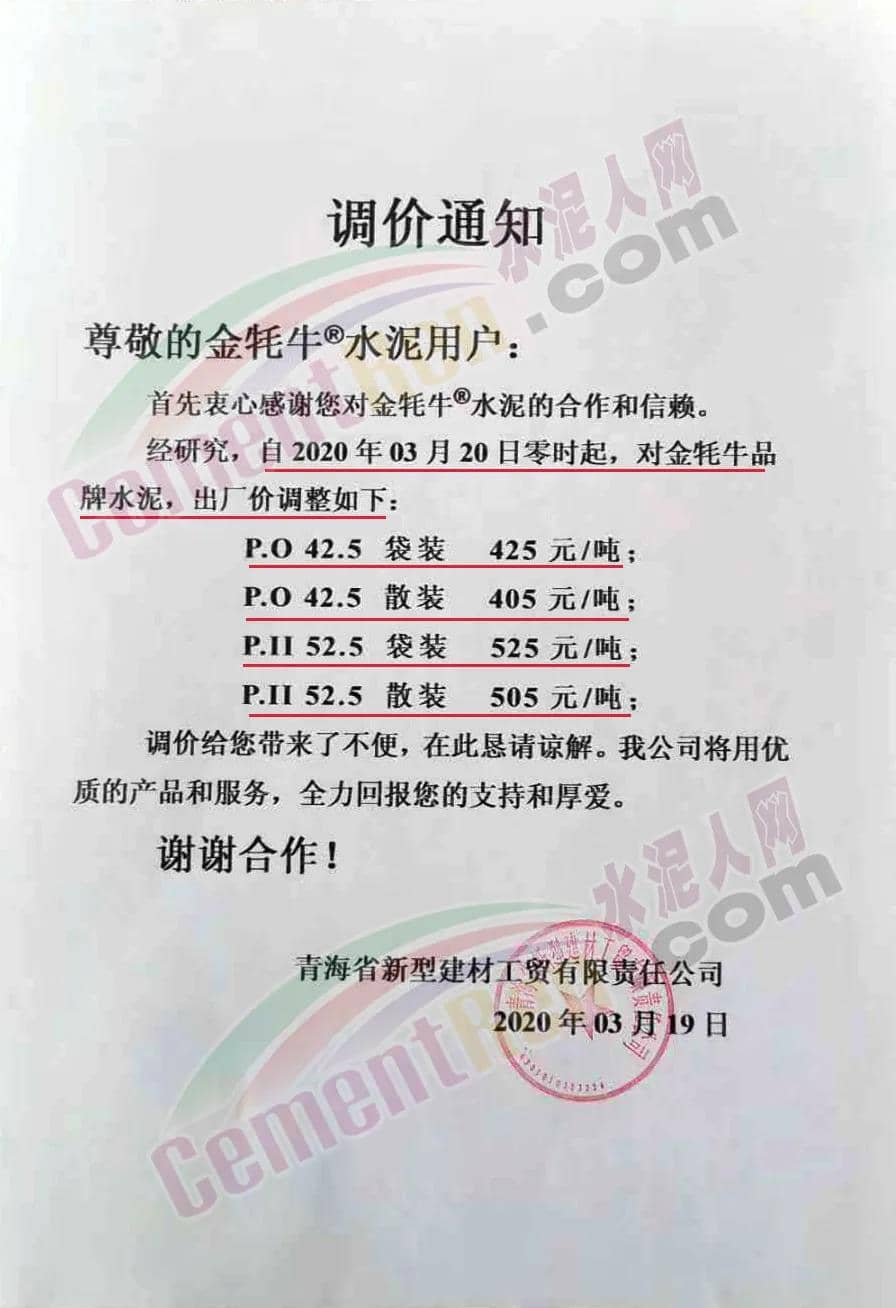 3月19日青海省新型建材工貿(mào)有限責任公司通知自3月20日零時起,對金牦牛品牌水泥出廠價進行調(diào)整。PO42.5袋裝水泥425元/噸,散裝水泥執(zhí)行405元/噸;P.II52.5袋裝水泥執(zhí)行525元/噸,散裝水泥執(zhí)行505元/噸。