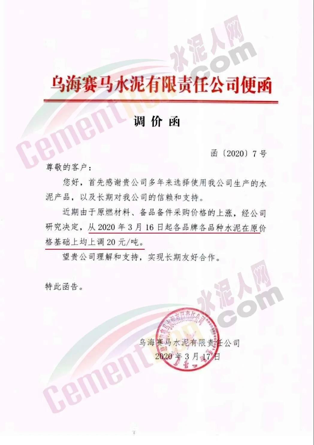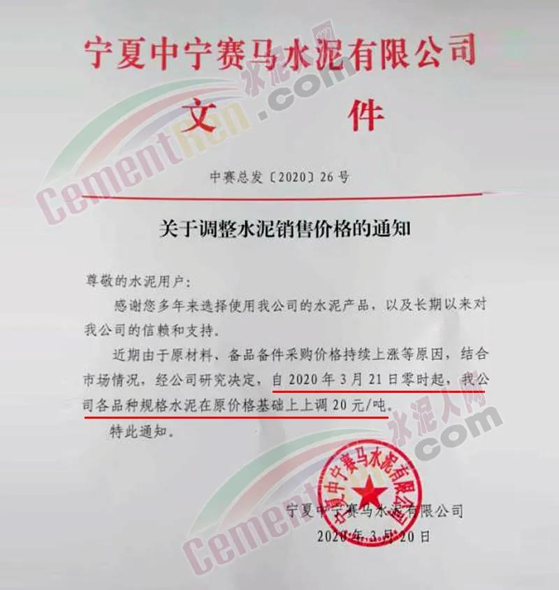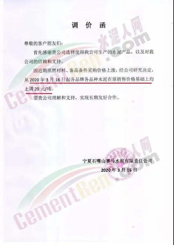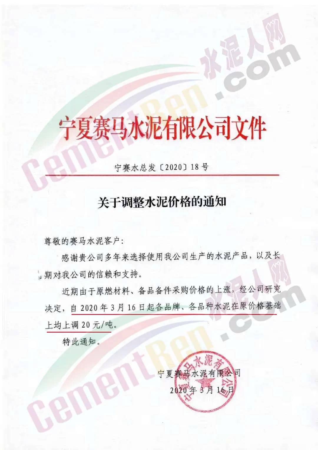 寧夏石嘴山賽馬水泥有限公司同一天通知上調(diào)各品種水泥價格20元/噸。
