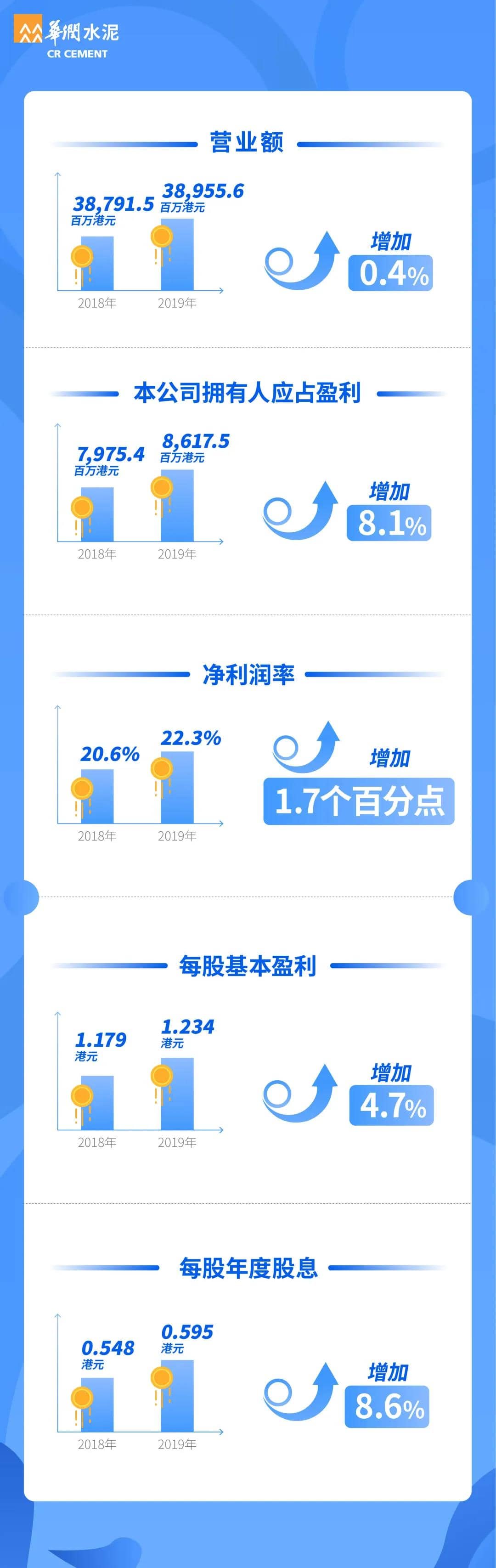 3月27日,華潤水泥發(fā)布2019年全年業(yè)績。2019年本公司擁有人應占盈利增加8.1%至86.2億港元,創(chuàng)歷史新高;全年派息59.5港仙、派息率達48.2%。公司立足華南、穩(wěn)中求進,推動轉型創(chuàng)新,積極探索產業(yè)鏈延伸的機會,在骨料、裝配式建筑及人造石材等新業(yè)務方面均取得突破。