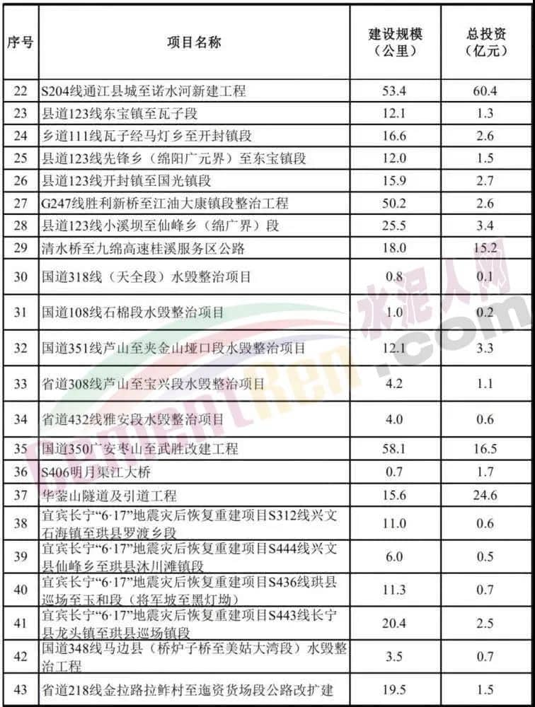 2、促進五區(qū)協(xié)同發(fā)展,強化路網(wǎng)互聯(lián)互通,如天府新區(qū)至邛崍、古藺至金沙等2個高速公路(81公里、195億元)、S204線通江縣城至諾水河等21個國省干線(241公里、92億元);