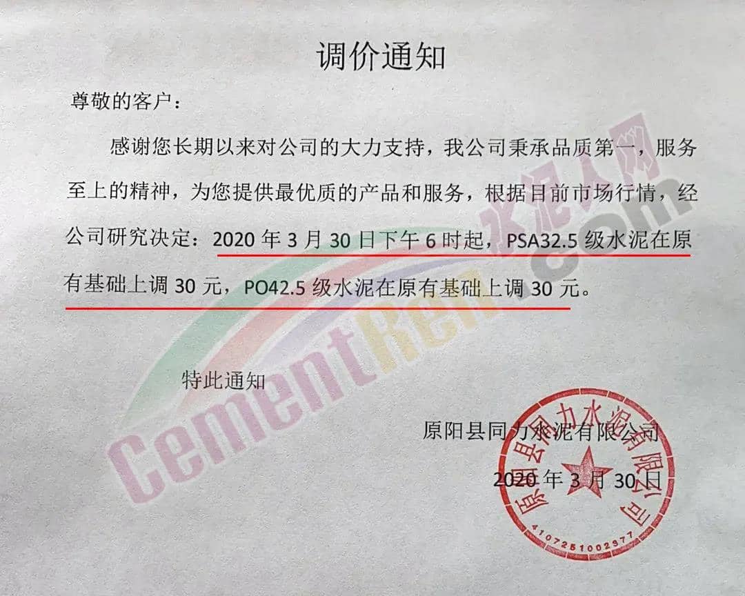 昨日(3月30日)原陽縣同力水泥有限公司發(fā)布調(diào)價通知稱:根據(jù)目前市場行情,經(jīng)公司研究決定:2020年3月30日下午6時起,PSA32.5級水泥在原有基礎(chǔ)上調(diào)30元,PO42.5級水泥在原有基礎(chǔ)上調(diào)30元。