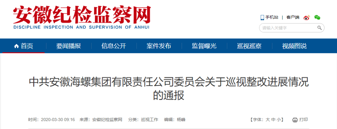 日前,安徽紀(jì)檢監(jiān)察網(wǎng)發(fā)布《中共安徽海螺集團(tuán)有限責(zé)任公司委員會(huì)關(guān)于巡視整改進(jìn)展情況的通報(bào)》文件稱:根據(jù)安徽省委統(tǒng)一部署,2019年5月20日至7月10日,安徽省委第三巡視組對(duì)海螺集團(tuán)公司開(kāi)展了巡視。2019年8月7日,省委巡視組向海螺集團(tuán)公司反饋了巡視意見(jiàn)。全文如下:
