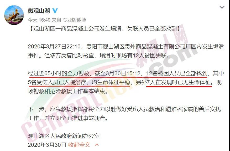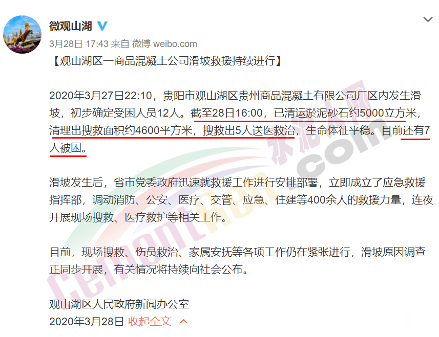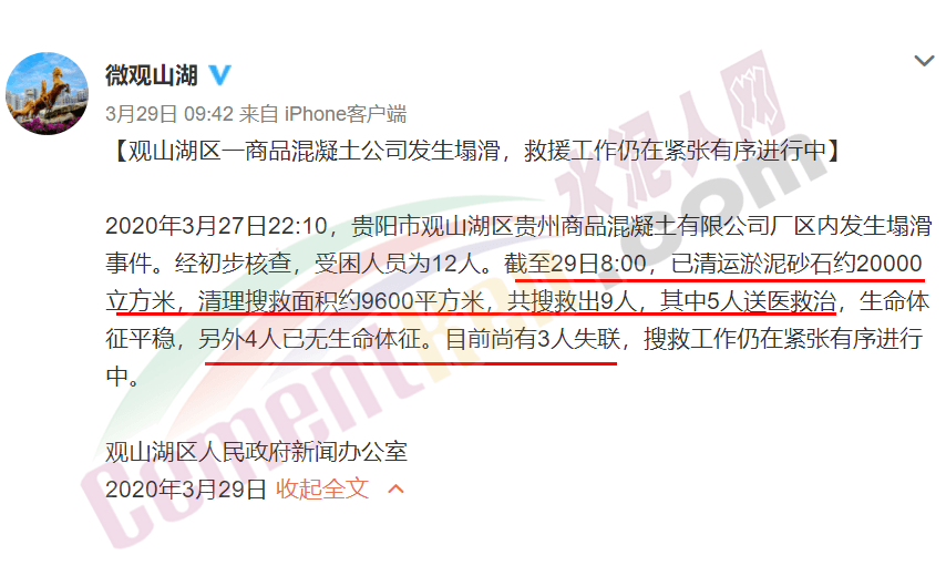 據(jù)貴陽市觀山湖區(qū)委宣傳部官方微博3月30日消息,2020年3月27日22:10,貴陽市觀山湖區(qū)貴州商品混凝土有限公司廠區(qū)內(nèi)發(fā)生塌滑事件。經(jīng)多方反復(fù)比對(duì)核查,塌滑時(shí)現(xiàn)場(chǎng)有12人被困失聯(lián)。