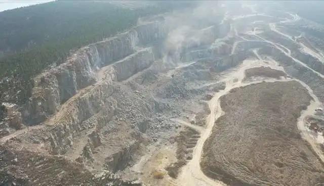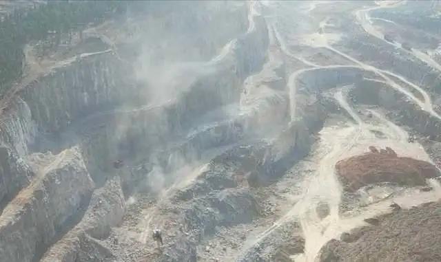 在航拍視頻升起后,隨著航拍不斷地向企業(yè)里側(cè)飛行,映入眼簾的景象令人震驚,整個(gè)采石場(chǎng)面積巨大,數(shù)十輛大型挖掘破碎機(jī)械正在工作,原石運(yùn)輸自卸車也依次排開(kāi),等待裝載,而開(kāi)采過(guò)程中產(chǎn)生的煙霧粉塵如同霧霾一樣四處飄揚(yáng),最里側(cè)風(fēng)炮機(jī)正在進(jìn)行爆破前的打眼填藥工作,鉆機(jī)工作期間也是粉塵煙霧彌漫,整個(gè)現(xiàn)場(chǎng)正如村民所說(shuō)污染肆意,在現(xiàn)場(chǎng)沒(méi)有見(jiàn)到任何的防塵降塵霧炮噴淋等環(huán)保措施,更不說(shuō)做好國(guó)土部門(mén)要求的邊開(kāi)采邊覆綠等措施,典型的屬于粗放式開(kāi)采施工,完全藐視《環(huán)保法》和《礦產(chǎn)資源法》的存在,開(kāi)山采石我行我素,生產(chǎn)污染肆無(wú)忌憚無(wú)所畏懼。