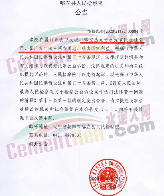 出事了!山水水泥非法占地!檢察院發(fā)公告!