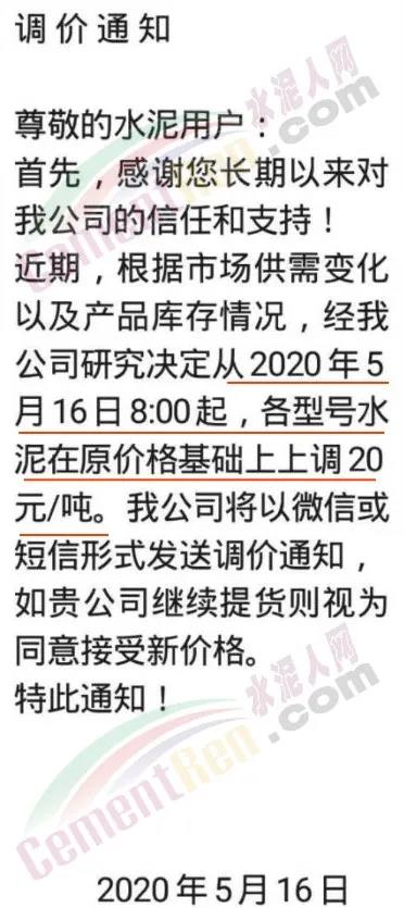 水泥人網(wǎng)通訊員消息,日前,陜西區(qū)域蒲城堯柏水泥通知自5月16日8時(shí)起上調(diào)水泥價(jià)格20元/噸。且表示 若繼續(xù)提貨,則視為默認(rèn)新價(jià)格執(zhí)行。